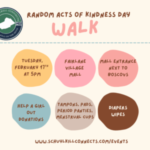 Schuylkill on the Move Random Acts of Kindness Walk Tuesday, February 17, 2026, at 5 pm Fairlane Village Mall, meet inside the mall entrance next to Boscovs Let’s give back while we get out of the house. We will be accepting donations for the annual Help a Girl Out Collection Drive. Donated feminine products and […]