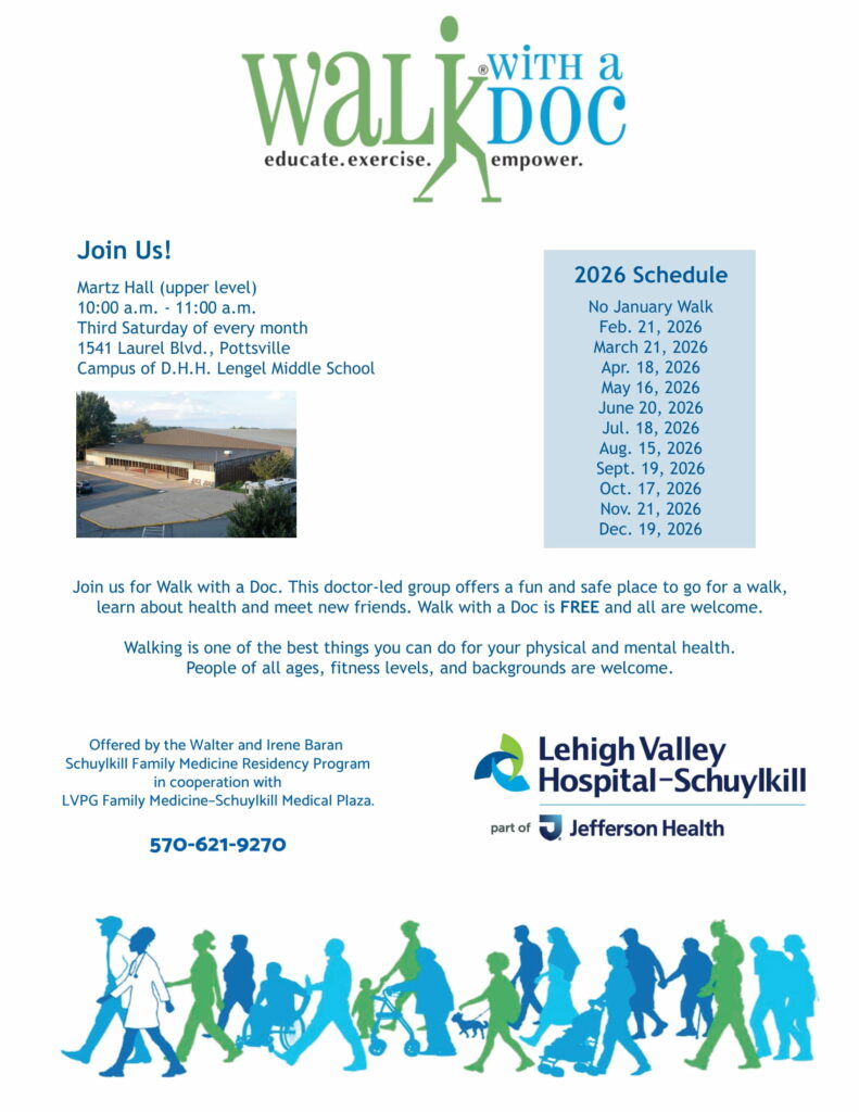 Lehigh Valley Health Network's Schuylkill Family Medicine Residency and Family Medicine programs conduct FREE monthly (third Saturday of the Month) Walk With a Doc events at Martz Hall, Pottsville. To learn more call 570-621-9270